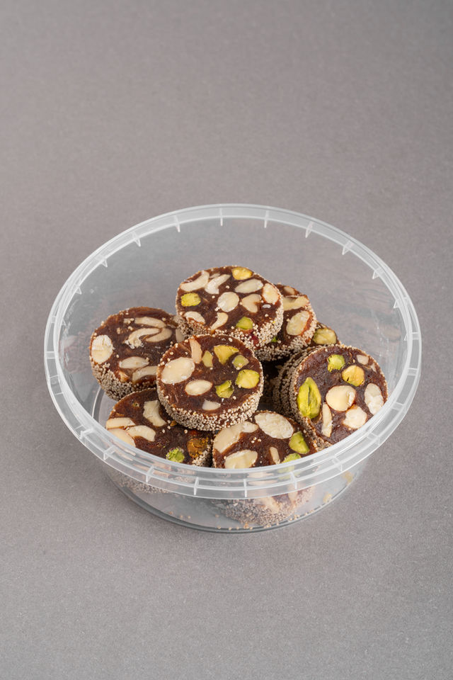 Each bite is filled with a delicious mix of cashews, almonds, pistachios, and walnuts, providing essential vitamins, healthy fats, and a crunchy texture that complements the softness of dates.